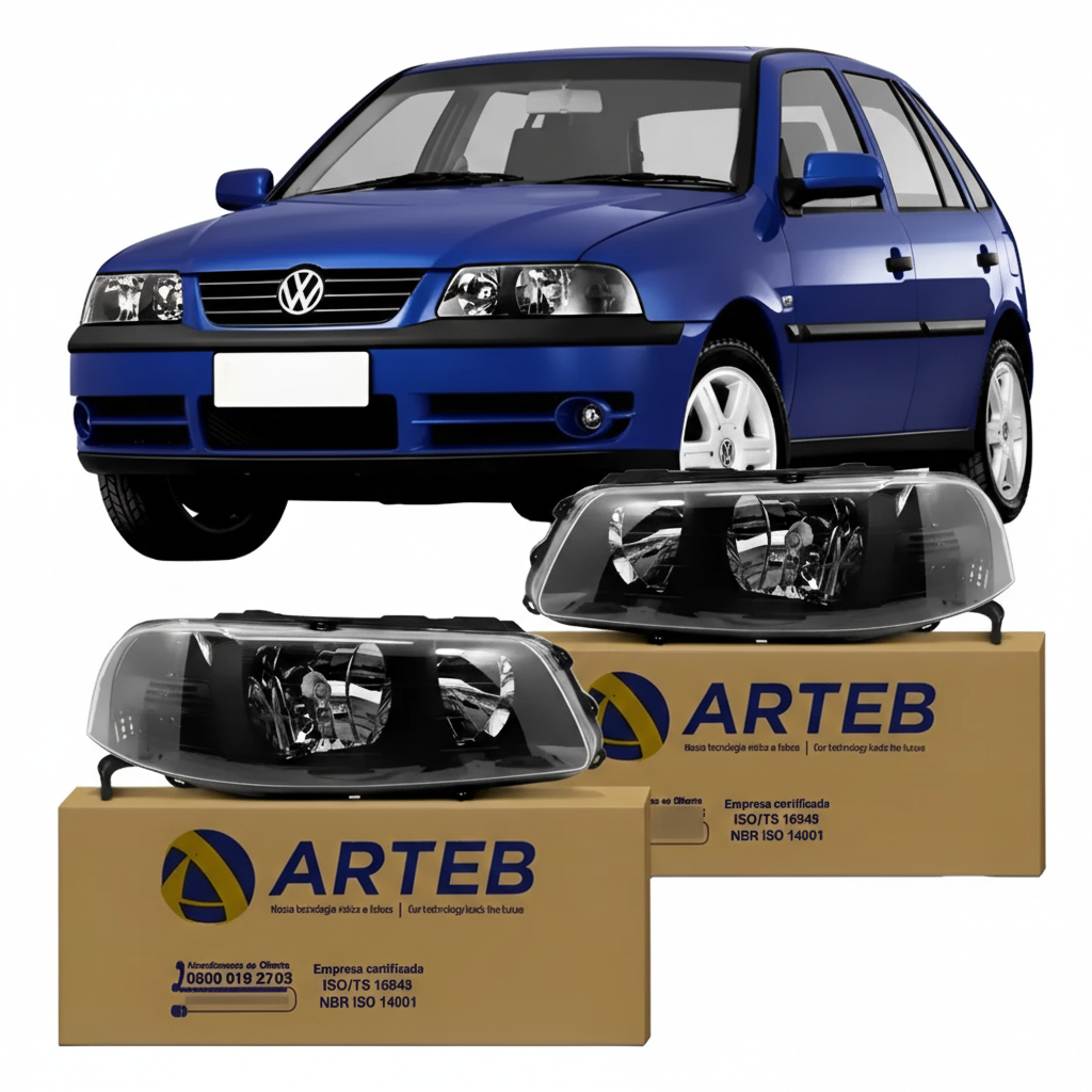 Par de faróis dianteiros com máscara negra, ideal para reposição original nos modelos Gol, Parati e Saveiro G3. Produto Arteb original, garantindo qualidade e durabilidade na iluminação do seu veículo.