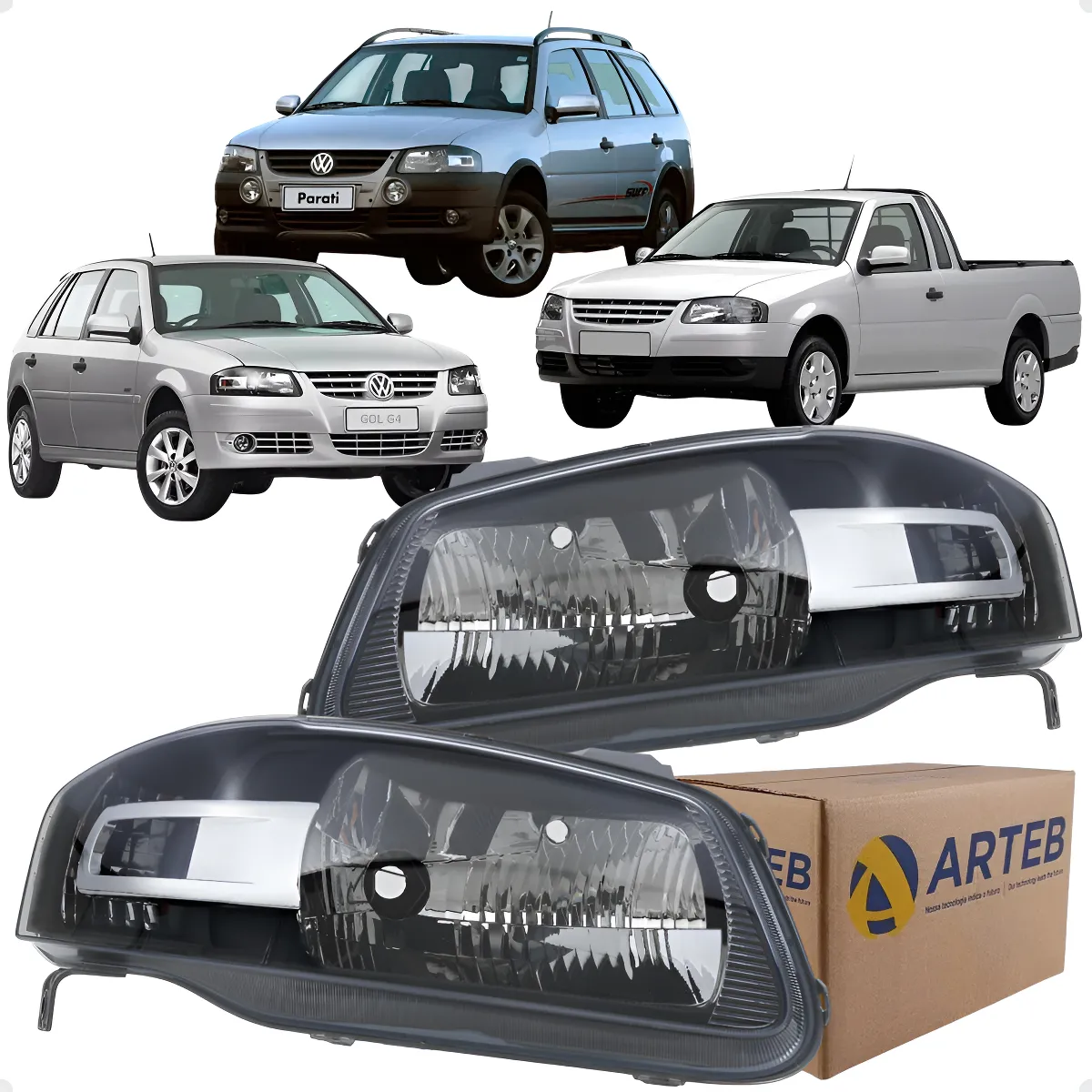 Faróis dianteiros originais Arteb com máscara negra, ideais para os modelos Gol, Parati e Saveiro G4 fabricados entre 2005 e 2014. Produto novo, composto por duas unidades (lado esquerdo e direito) que garantem uma iluminação clara e eficiente.